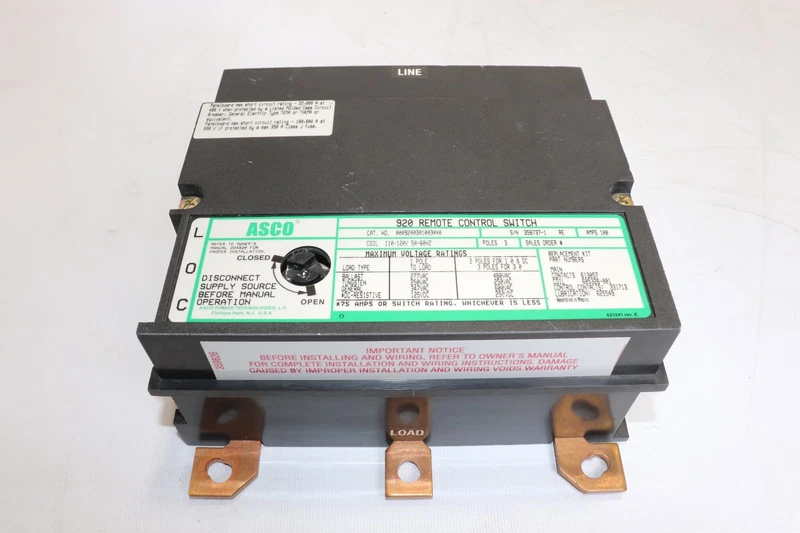 ASCO 9200301003000 100A 3-POLE 920 REMOTE CONTROL SWITCH 110-120V COIL 50-60HZ