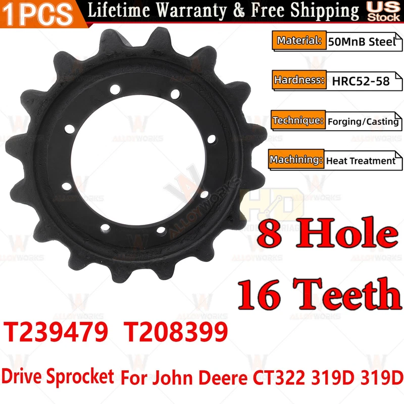 A heavy-duty 8-hole 16-tooth drive sprocket designed for reliable power transmission in compact track loaders, ensuring durability and precise fit for specific equipment models.