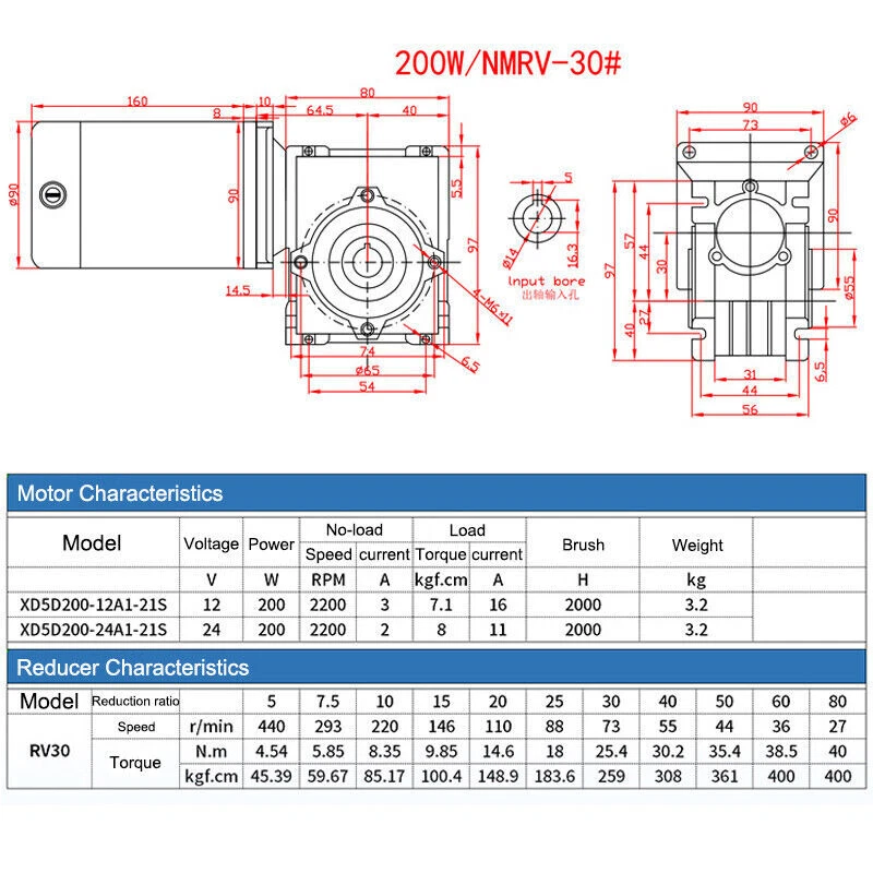 RV30 200W Worm Geared Motor DC 12V 24V High Torque 400kg Reversible Self-locking
